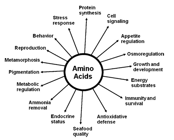 Besides the main function as a required component for the polypeptides and other nitrogenous substances synthesis, they have five essential roles in the regulation and nutrition of the animals; these major roles can be played in the cell signaling, antioxidative defense, chemical sensing, epigenetic regulation and transcription and protein modifications, in addition, these nutrients play other roles in the growth, development, survival, disease prevention, and some disorders treatment (digestive, muscular, reproductive and cardiovascular systems) (Wu G 2013). Likewise, organisms can synthesize from amino acids important biologic products such as feathers, scales, antibodies, enzymes, and hormones (Lee 2015). Fafournoux, Bruhat(2000) stated that the amino acids could play clearly, jointly with hormones, a key role in the control and modification of gene expressions at the levels of transcription and stability of mRNA. They are essential for fish as energy substrates, for and metabolic pathways regulation (Andersen et al., 2016). In the following figure (Fig 1), Wu (2009) summarized the possible roles of amino acids.