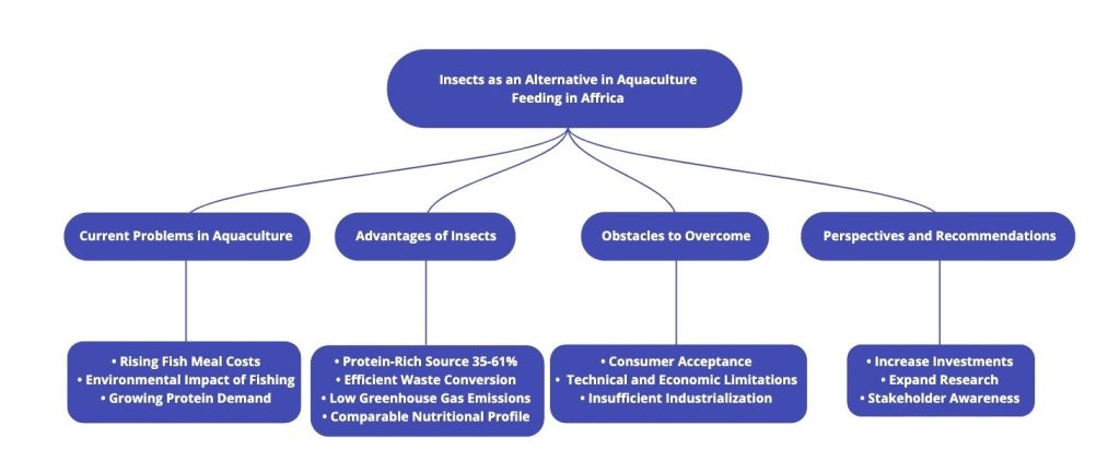 The growth of aquaculture and the increasing demand for farmed fish have led to an increase in the price of meal and used in fish feed in recent years, which represents a constraint for the development of aquaculture in Africa, considering that aquaculture feed represents 50 to 70% of production costs, this has led to a growing interest in alternative sources. Over the last decade, insect meal has gained popularity in the aquaculture feed industry in Africa, due to the rising costs and decreasing availability of fish meal, insect meal is now seen as a promising ingredient in aquaculture due to its nutritional value, efficient feed conversion and sustainable production potential. The growing interest in insect meal as a substitute for fishmeal in aquaculture has gained momentum in recent years, following the significant number of scientific publications and research studies devoted to the subject, indicating a growing recognition of the potential benefits of insect meal.