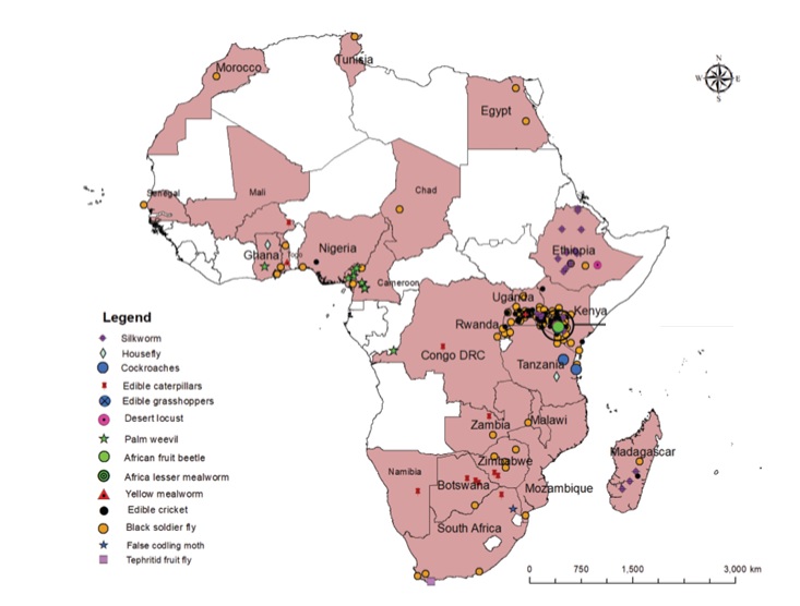 Fig. Distribution of semi-domesticated and domesticated edible insect species in Africa. Countries shaded in white have no insect farming activities and those shaded in brown have operational insect farms for food and feed.