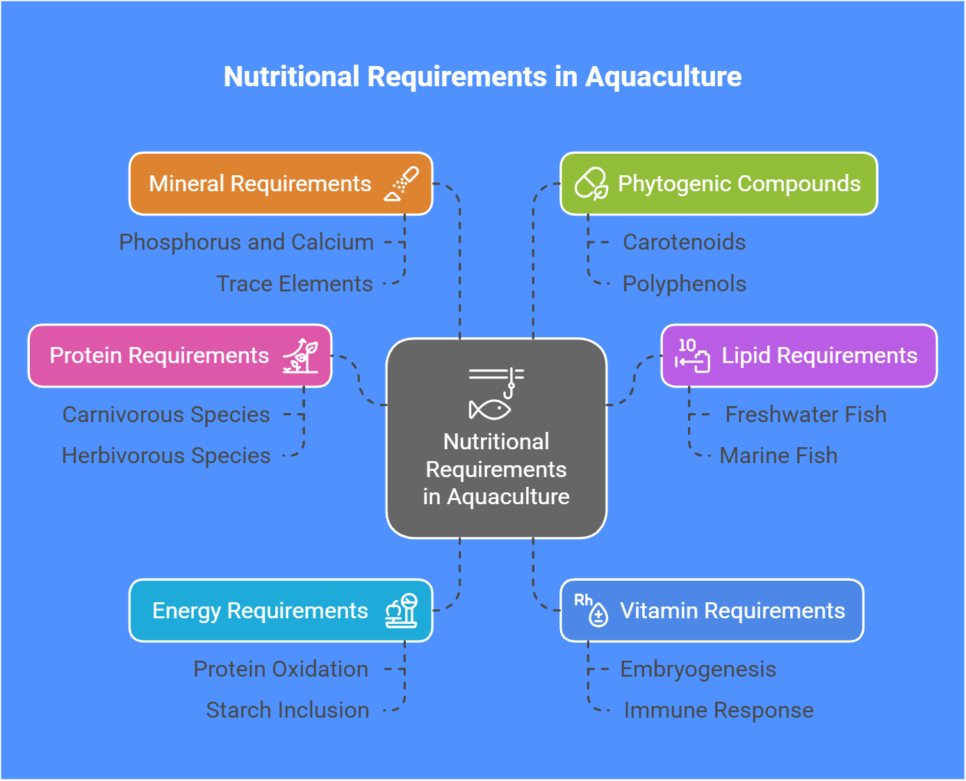 Understanding the nutritional requirements of fish is essential for optimizing aquaculture practices and ensuring the health and growth of various species. By addressing the specific needs for proteins, lipids, carbohydrates, vitamins, minerals, and phytogenic compounds, aquaculture can continue to thrive and meet global demands