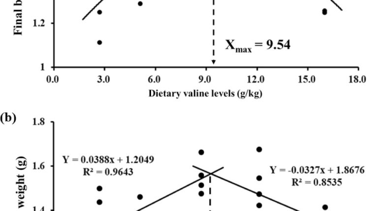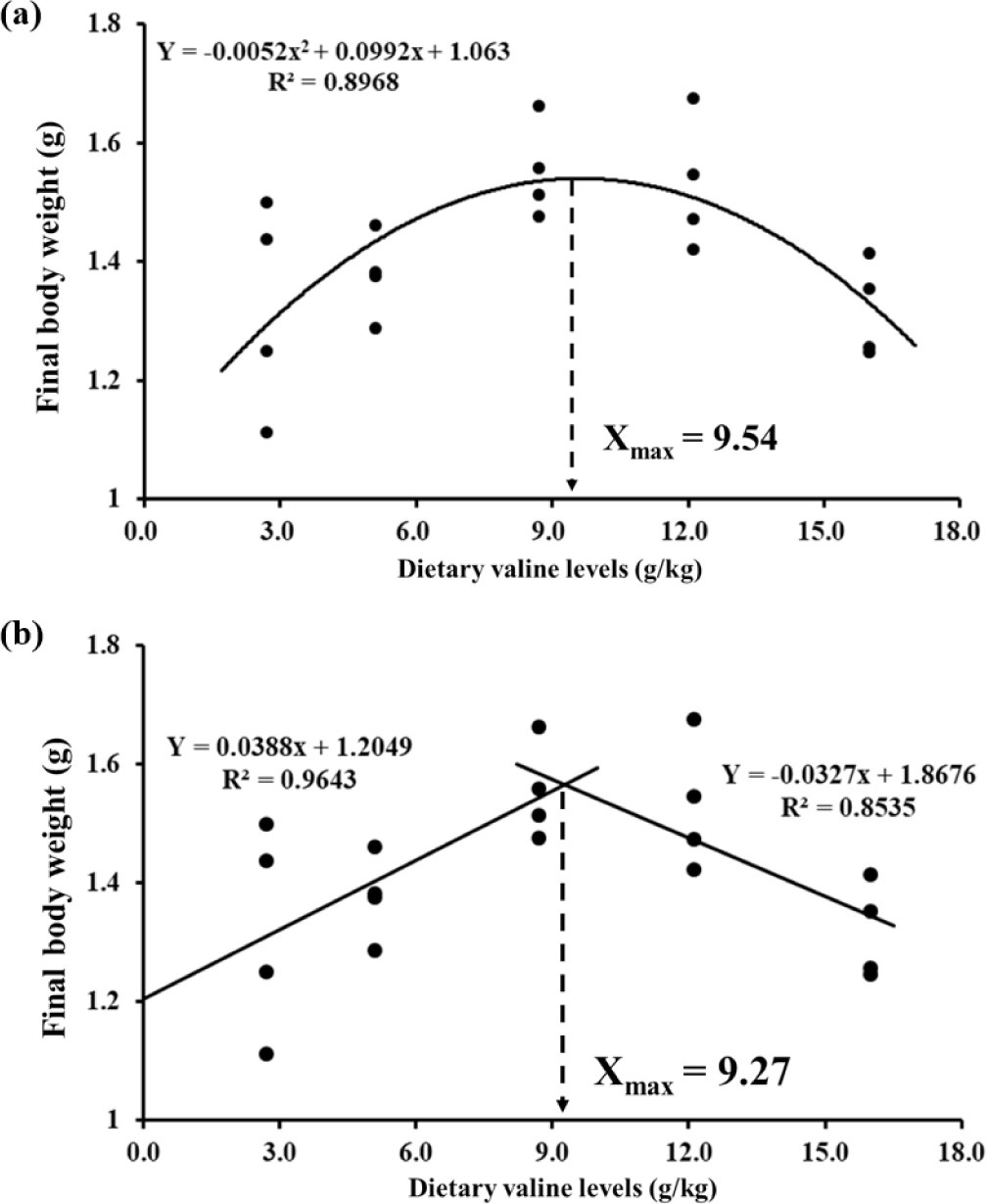 Fig. Relationship between final body weight (g) and dietary valine levels based on (a) polynomial regression method and (b) broken-line regression analysis, where X represents the optimal dietary valine level for juvenile Pacific white shrimp (Penaeus vannamei).