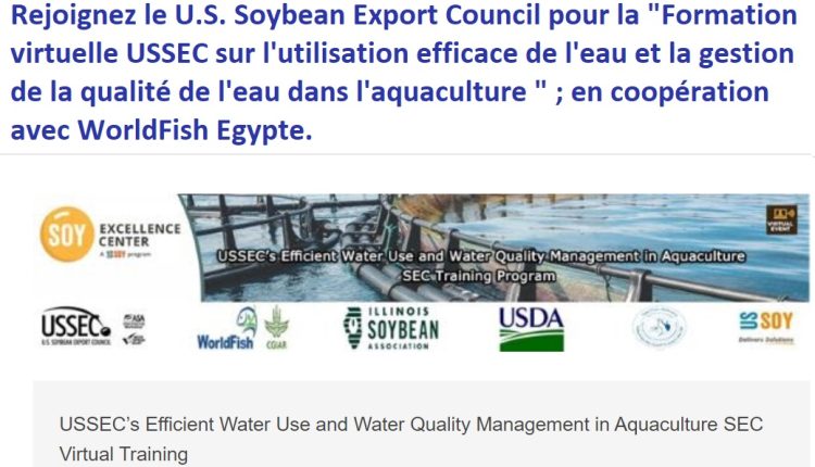 Rejoignez le U.S. Soybean Export Council pour la « Formation virtuelle USSEC sur l’utilisation efficace de l’eau et la gestion de la qualité de l’eau dans l’aquaculture SEC » ; en coopération avec WorldFish Egypt qui se tiendra le :