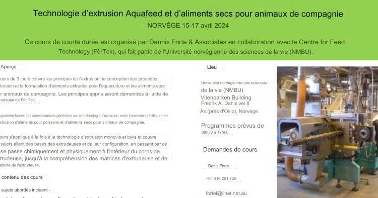 Le Norwegian Center for Feed Technology organise du 15 au 17 April 2024, des cours sur l’extrusion des aliments aquacoles, en collaboration avec la société australienne Forte and Associates. Veuillez prendre un moment pour consulter la brochure pour plus de détails. INSCRIPTIONS FERMER 29 MARS 2024